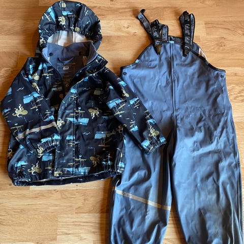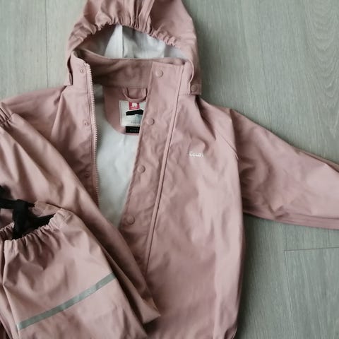 To delt regnsett med kult mønster fra norske CeLaVi str 110/5år selges. Brukt av et barn i 1,5 sesong. Helt og fint.
