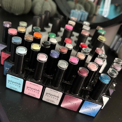 En kosmetikkveske med hjul. Inneholder 25 brukte, nesten fulle gelnagler, 25 vanlige gelnagler, 4 topcoats, 4 gelnagler, en håndskrubb, diverse neglekunstartikler, klistremerker, stempler, glitter og mer. Alt på bildene.