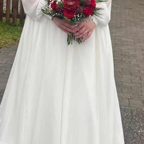 Jeg veide ca 89 kilo ved bryllupet og er 1.77cm høy. Kjolen har god justering bak. Anbefales prøvd mellom str 42-46 ca.