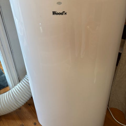 Selger den da jeg har kjøpt varmepumpe. Enheten har kontrollpanel med modusvalg, temperaturdisplay og justerbar viftehastighet. Følger også med kontroller til den som du kan justere alt på. Den er utstyrt med hjul for enkel flytting og en utløpsslange for varm luft. Følger også med vindustrekk for å tette rundt utløpsslangen.
