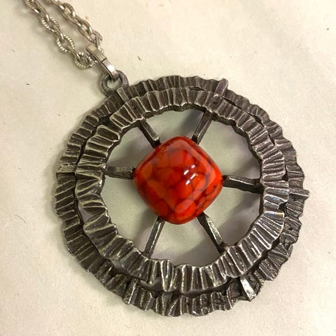 Flott vintage retro halskjede i tinn med rød stein - trolig Astri Holthe selge kr 275,-