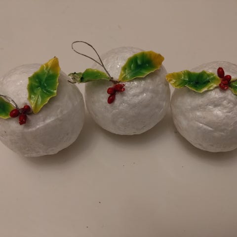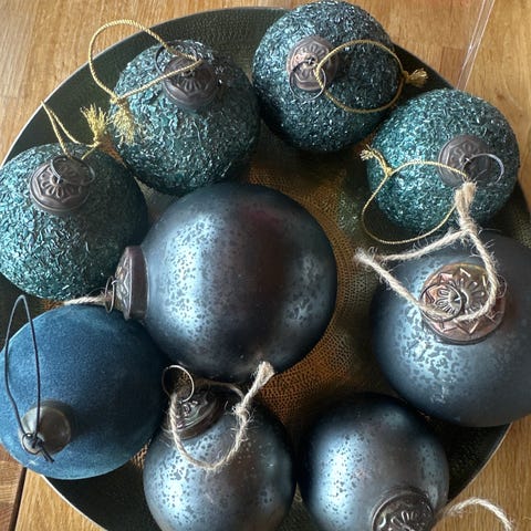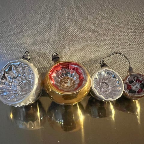 Julekuler i ulik størrelse. Stjerne og rød kule følger ikke med.