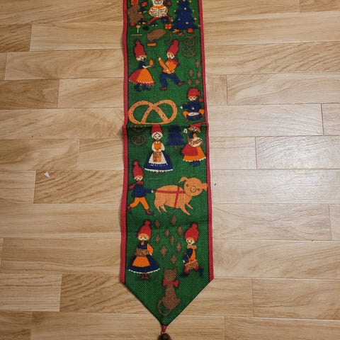 Helt nydelig vintage veggløper til jul. Den mangler oppheng, men det er en åpning øverst til å tre en pinne e.l som kan brukes til å henge den opp, evnt kan den henges opp med tegnestifter e.l. Den kan også brukes som duk. Det har gått opp noen sting øverst på baksiden, der hvor en eventuell pinne skal være og foret har løsnet fra sømmen noen steder på sidene, ellers fin. 90x19 cm.