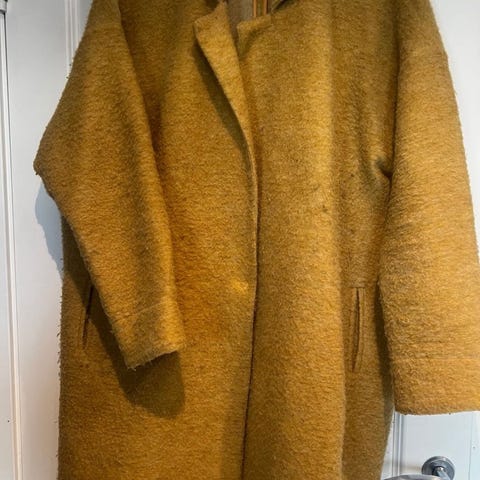 Flott kåpe i ekte skinn med pelsfor. Størrelse 44, lenge 140 cm, grå med brunt pelsfor