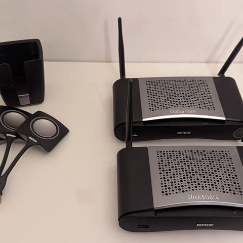 Selger en pent brukt Barco clickshare løsning med 3 knapper. Dele skjerm til projektor? Storskjerm? Eller rett og slett mot tv hjemme. Barco clickshare kan brukes av Windows. Mac OS. Android mobil telefon og Iphone samt nettbrett. Enkel deling gjennom QR kode som vises på skjermen. Kan kobles til nettverket hjemme eller på jobb for utvidet deling via nettverk. Eller brukes med Clickshare sitt eget lokale nettverk uten å motte koble dette opp mot nettverket hjemme eller jobb - hytta eller der du vil bruke denne.