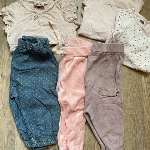 3 bodyer med lang arm. 1 body med kort arm. 1 pysj. 2 sett med bukse og topp. 1 skjørt.