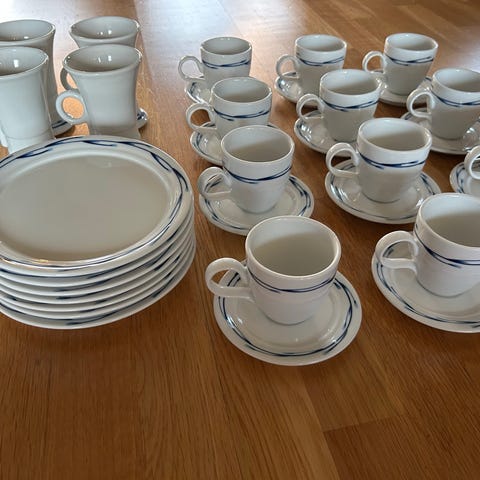 Hvitt med blå kant. Mye brukt i forsamlingshus o.l.