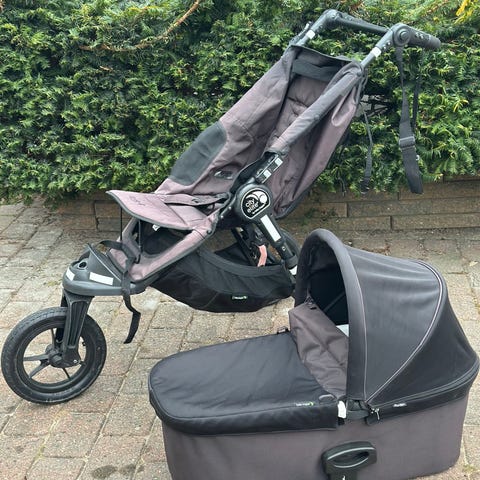 Babyjogger City Elite med grått stoff. Passer fra nyfødt til 3/4 år, Med myk innvendig polstring og justerbart solskjerm. Understell med tre hjul, stødig og lett å trille.