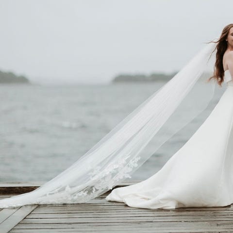 Nydelig brudeslør på ca 4 meter. Kraftig kam til å feste til hodet. Dobbeltslør som kan ligge frem over ansiktet om ønskelig. Vakre kanter og små blomster et par steder. Kan sendes eller prøves i Bergen.