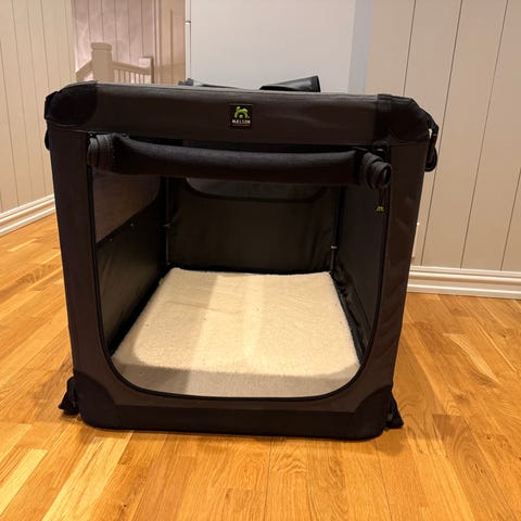 Buret kan slås sammen, så det er lett å lagre. Det kan trilles, omtrent som en koffert.