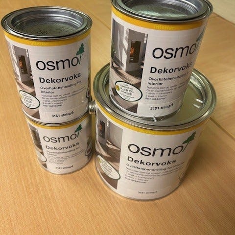 Osmo dekorvoks selges billig da det ble feil farge her for meg. Jeg har kun åpnet og testet den på et lite område, så den er i praksis ubrukt og helt full.