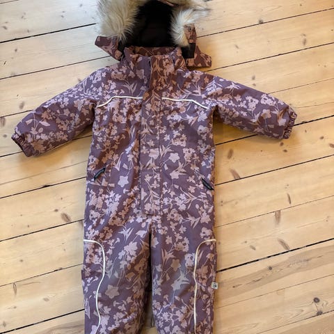 Varm kjeledress med avtakbar hette. Nydelig rosafarge med pent dyremønster. Pent brukt av et barn en sesong. Ingen anmerkningen utenom at den ene fotstrikken har noe slitasje (se bilde).
