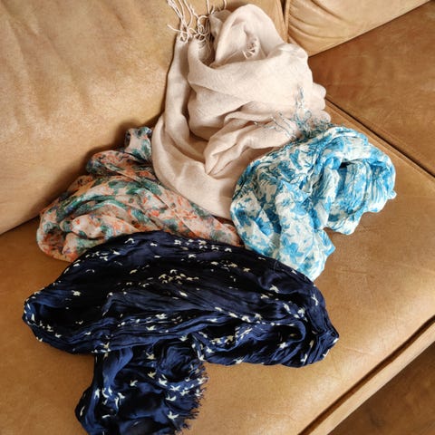 H&M og med flere, andre merker av skjerf i flerfarget design, med størrelsen one size. Skjerfene har ulike mønstre og teksturer, og er egnet for kvinner.