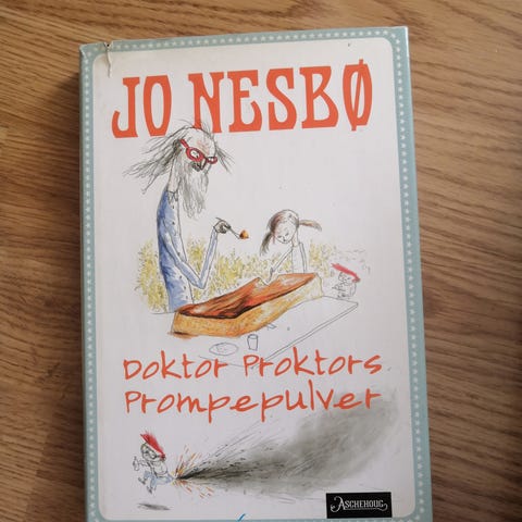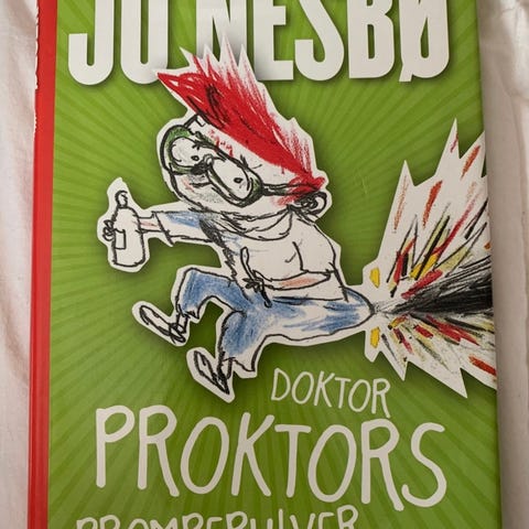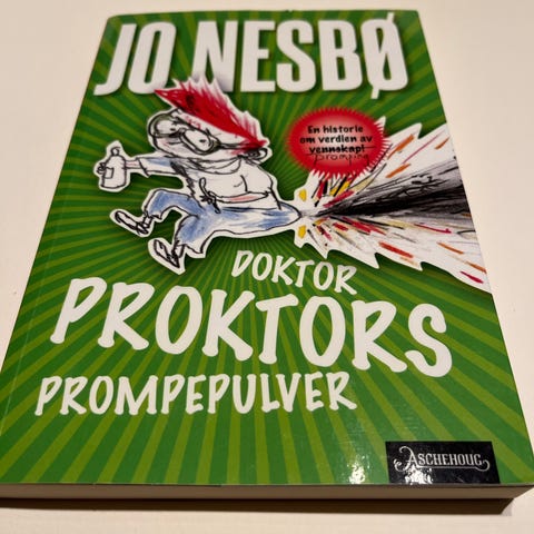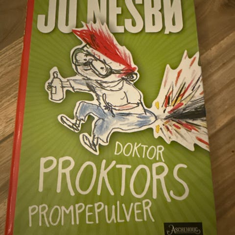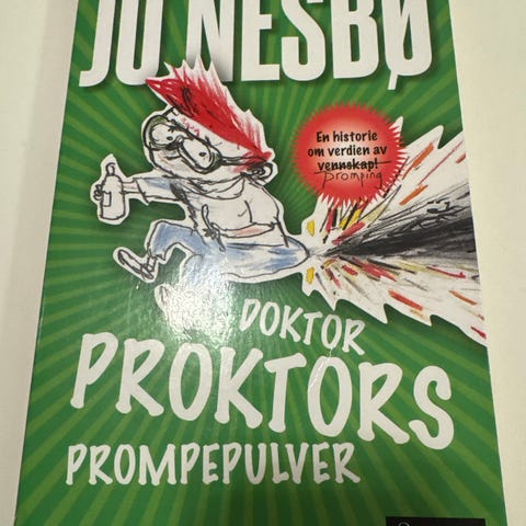 Jo Nesbø sine Doktor Proktors prompepulver. Bok nr 1 og 2 selges. Mangler illustrasjonsomslaget ellers flotte.