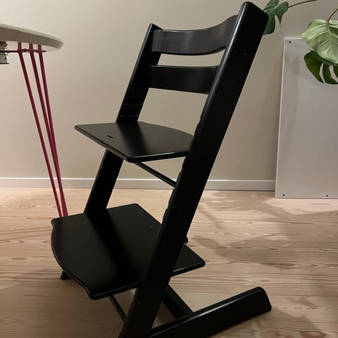 Justerbar sitte- og fotstøtte. Laget av tre.