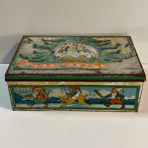 Motivet rundt boksen er pent. Lokket er falmet og slitt.