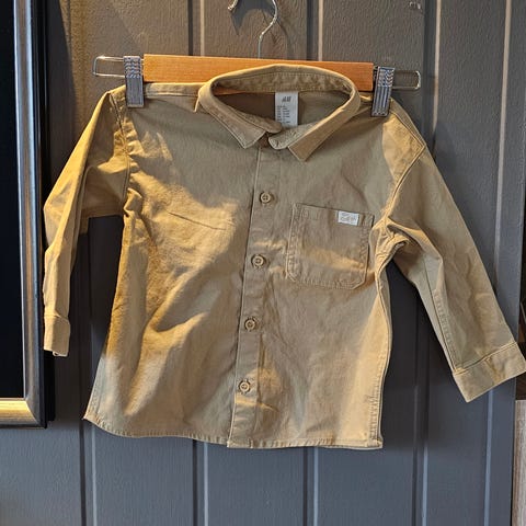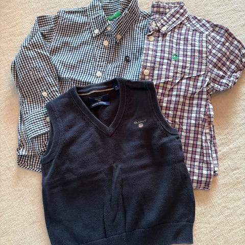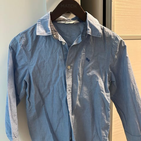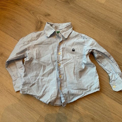 Benetton skjorte i blå farge, størrelse 92, beregnet for gutt. Skjorten har lange ermer og knappelukking foran. Materiale og andre detaljer fremgår av bildene.