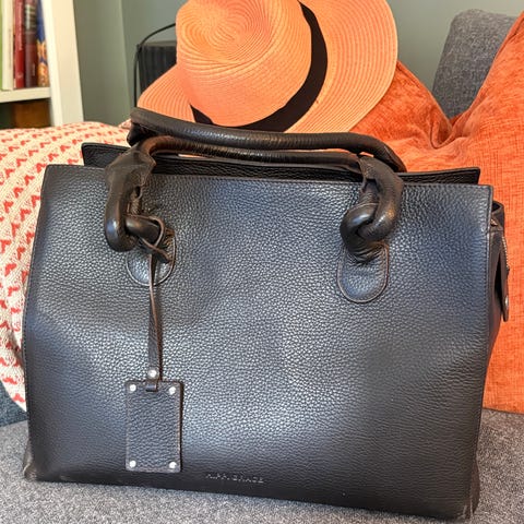 Norsk design. Håndveske som kan brukes på 3 måter, derav navnet. Brunt skinn. Håndleddstropp og crossbodystrop medfølger. Du kan også bære den uten stropper, se bilde lånt fra nettet. Lommer inni. Mål: se bilder.