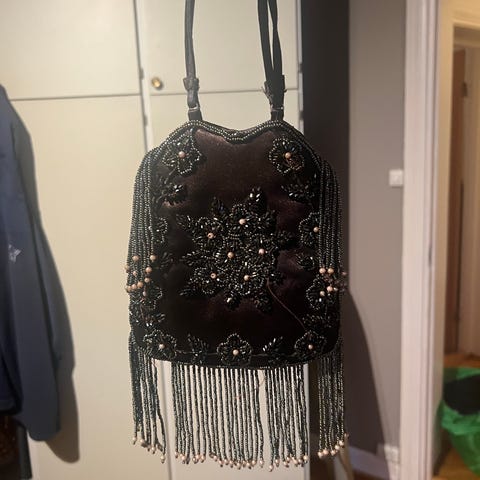 Fint til f.eks festdrakt. En liten selskapsledelse de almosphere. Med kjetting skulderereim. Mønstret stoff på ene siden og glatt stoff på andre siden. Den er 19x15 cm, med trykk lås. Selges for 130kr.