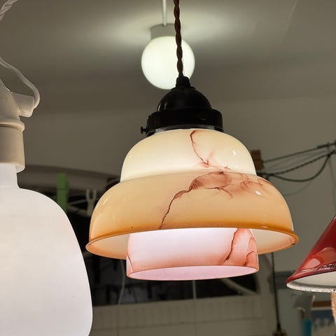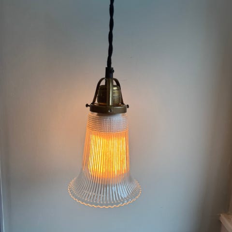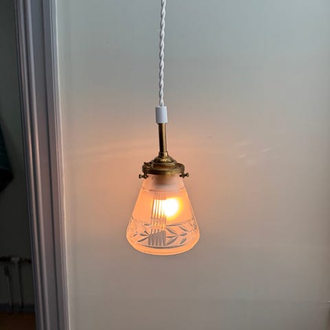 Glass-pendel med gammelt pære-feste i messing, - med på-av bryter.