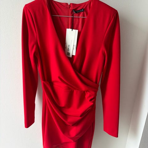 NA-KD festkjole i rød farge, størrelse 38 for kvinner. Kjolen har langermet design og er laget av et materiale som ikke er spesifisert. Egnet som festkjole.