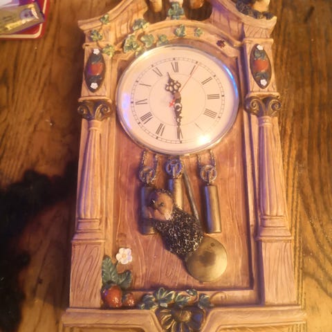 Veggur i tre utskåret av ett trestykke med trollmotiv. Klokka har analog urskive med tydelige tall og visere, og er montert i en dekorativ ramme med utskårne og malte detaljer. Uret drives av et batteridrevet urverk plassert på baksiden. Egnet som veggklokke og dekorativt innslag i interiøret.