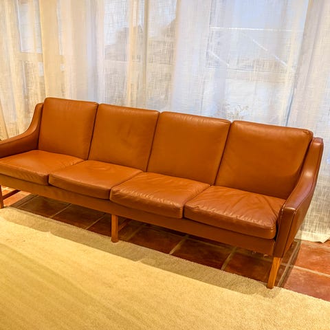 Selger min elskede sofagruppe i oransje/lys brun skinnfarge.
