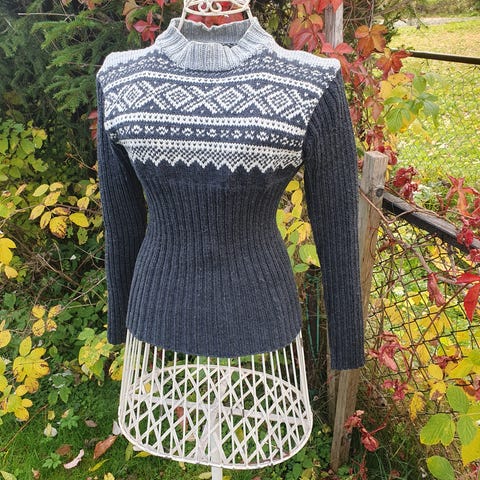En lys og pent brukt ullgenser. Hjemmestrikket.