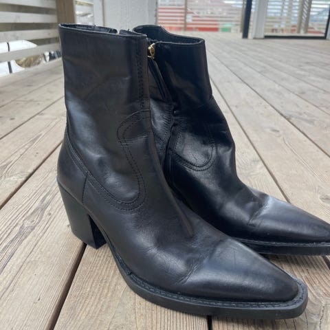 Mango hæler i størrelse 36. Skoene er laget av svart lakkskinn og har spiss tupp. De har åpen hæl med stropp og lukking med spenne. Hælhøyden er lav til middels, og skoene er designet for damebruk.