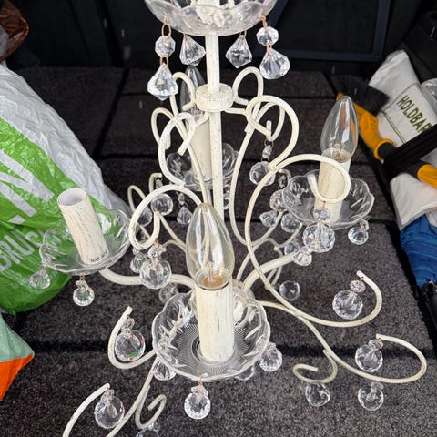 Hvit lit eldre taklampe i retro still som var brukt på badet. Denne kan også bruke ute.