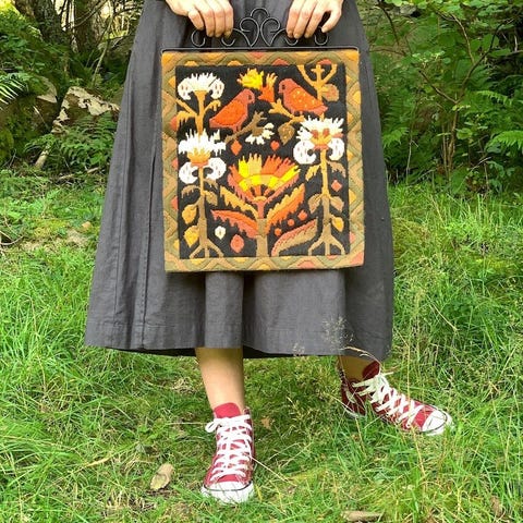 Håndlaget veggteppe med kjøttmeis broderinger