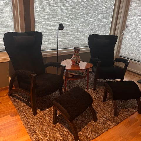 Stolen er trukket med ekte saueskinn, som er lunt og behagelig. Baksiden av stolen har stofftrekk.