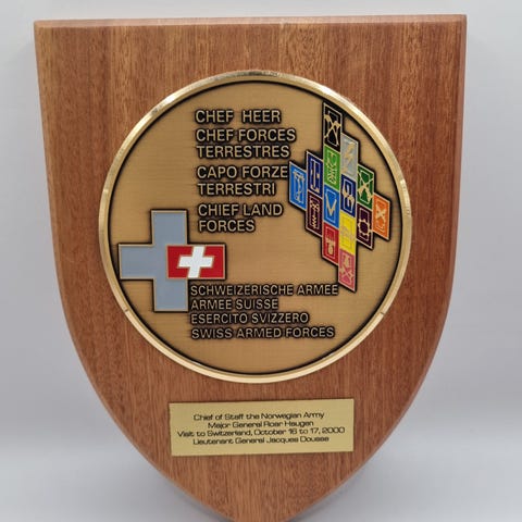 Plaketten ble presentert til generalmajor Roar Haugen av generalmajor Tryggve Tollefsen den 20. november 1999.