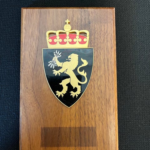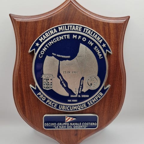 Våpenskjold, crest, plakett, MFO, Sinai, Egypt, fredsoperasjon, norsk militær, samlerobjekt, internasjonal styrke, Multinational Force and Observers, militærhistorie, general Roar Haugen, Tryggve Tollefsen, militær suvenir