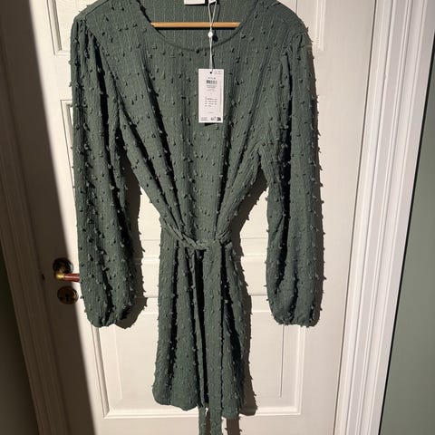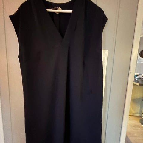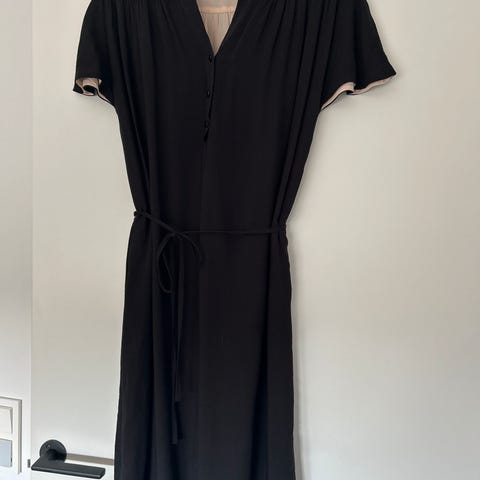 Vila Hverdagskjole i størrelse L, fargen svart. Kjolen har knappelukking foran og belte i livet. Materialet har en tekstur med mønster, egnet for hverdagsbruk.