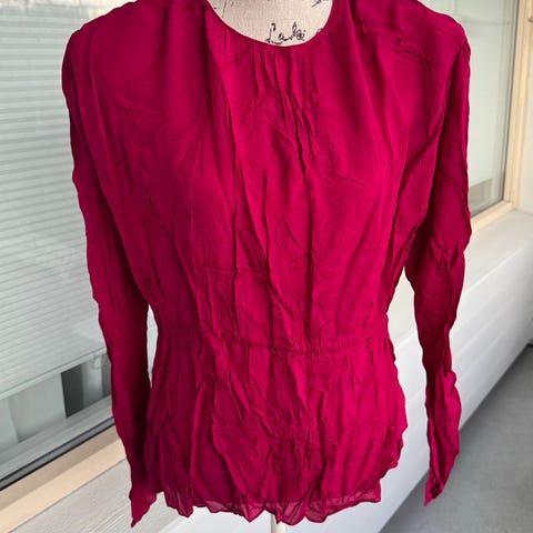 Zara Bluse i størrelse L , farget rosa. Laget av 100 % polyester. Blusen har lange ermer, V-hals og en løs passform med lagdelt design nederst. Produktet er laget i Italia.