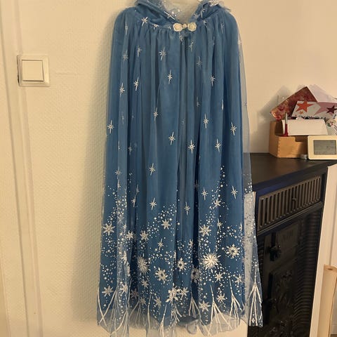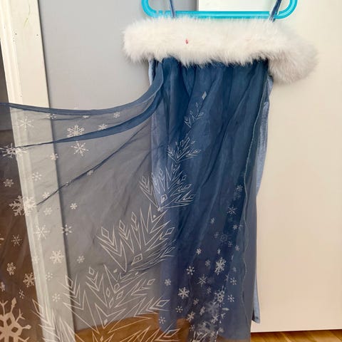H&M Elsa barnekjole i blå farge, størrelse 152, designet for jenter. Kjolen har lange ermer og et mønster som etterligner frosttema, med en pelskant rundt halsen. Laget av materiale som gir en glansfull effekt og inkluderer en gjennomsiktig kappe bak.