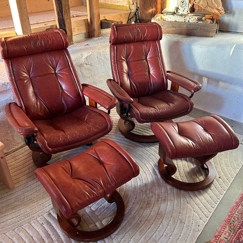 Stressless stol i skinn fra Ekornes, med fotskammel. Noe slitasje(se bilder)