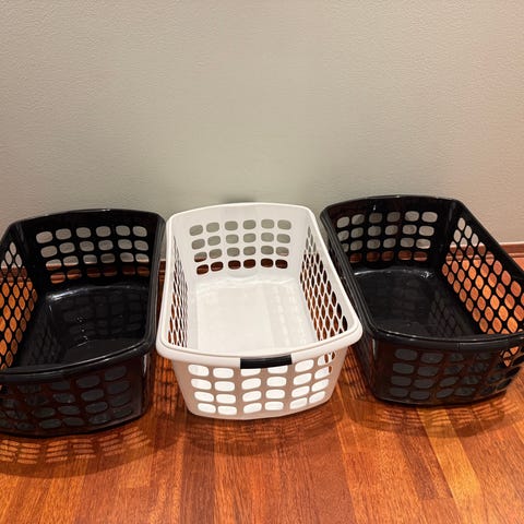 Kurven har et hullmønster som gir ventilasjon. Den er rektangulær med avrundede hjørner og har en størrelse som passer til oppbevaring av klær eller andre husholdningsartikler. Merk at kurven har en sprekk i plasten, som vist på bildet.
