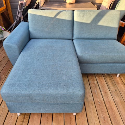 Selger denne behagelige og flotte sofaen, som er i et slitesterkt stoff.