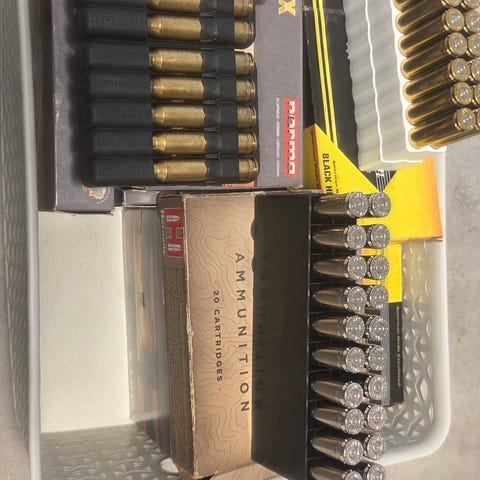 Selger unna litt ammunisjon for å rydde plass. 8 esker med 30-06, og én med 8x57. Alle selges i 20 pakking, med unntak av de som ikke går opp i 20. Som det vises av bildene er alle av samme parti.