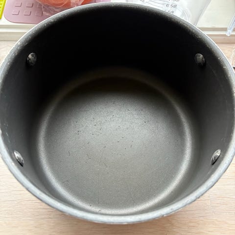 Den har synlige bruksmerker og tegn på slitasje, spesielt på bunnen.
