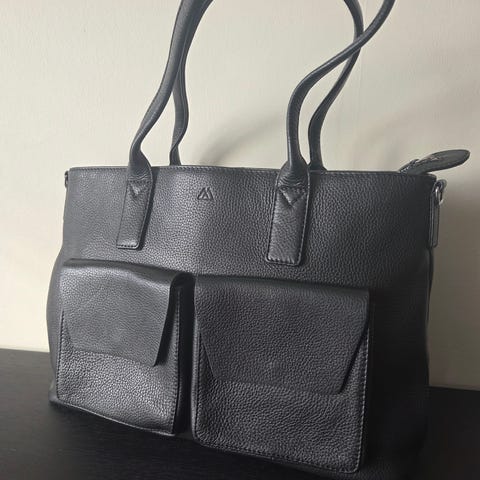 Vesken er laget av ekte kalveskinn, har flotte detaljer på fronten, med en asymmetrisk detalj. Under den skrå klaffen er det en lomme med lekkert preget skinn, i en slangelook. Innvendig er det en et åpent rom, samt to glidelåslommer. Klaffen lukkes med magnetlås, og på baksiden er det en glidelåslomme.