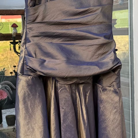 Festkjole i størrelse M for kvinner, beige farge med paljetter og blomstermønster. Kjolen har kort erme, V-utringning og glidelås bak. Materialet er lett og delikat, egnet for formelle anledninger.