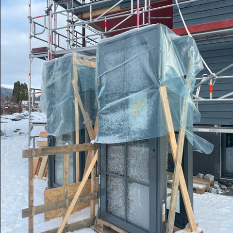Altandør med glass, håndtak og lås, høyre hengslet. Hvit innvendig, blå utvendig. Døren har et stort glassfelt som gir lysinnslipp. Passer til bruk som altandør, til bod, ytterdør eller innerdør avhengig av behov. Ved uttag liten sakde i ramme som kan limes på plass. Må hentes.