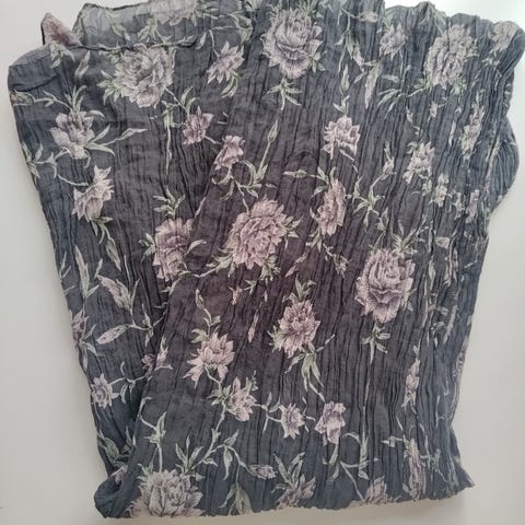 Veldig mykt og behagelig viskoseskjerf med blomstermønster og frynser. Hullmønsteret i stoffet bidrar til at det faller ekstra fint og føles godt rundt halsen.