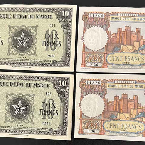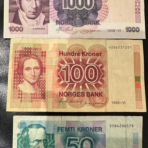 Libanon sedler i valørene 5, 10 og 2000 Rials. Sedlene har ulike historiske og kulturelle motiver, inkludert arkitektur og landskap. Materiale: papir.