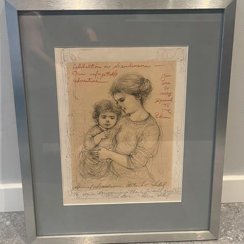 Innrammet kunstverk med svart-hvitt motiv av en nisse som holder en lykt. Bildet er montert i en ramme av tre. Baksiden av rammen har oppheng for veggmontering.