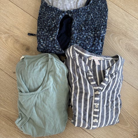 Den siste genseren har et lite hull på magen pluss hull i albuen og må nok lappes der. Den er i merinoull.