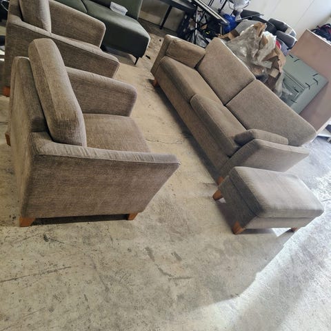 2 setter sofa og en stol i beige stoff. Sofaen har to seter med mønstret rygg- og sittepute, og stolen har matchende design. Begge møblene har stofftrekk og en klassisk form med avrundede armlener. De er kjøpt fra Fagmøbler